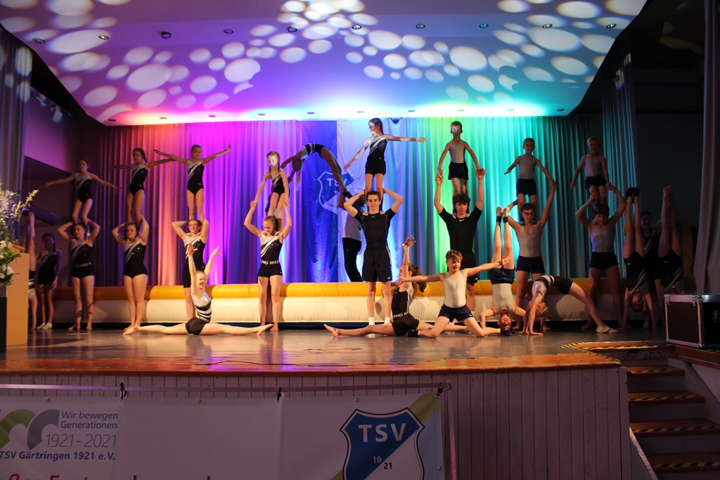 Einen tollen Abschluss des Bühnenprogramms bot die Turnabteilung mit einem actionreichen Auftritt auf dem Airtrack. Die Turnjugend begeisterte dabei mit einer bunten Mischung aus Sprüngen, Saltos und Flickflacks. Aber auch die Gäste wurden ins Programm mit einbezogen: ganz offiziell durfte das Smartphone gezückt werden, um bei einem Online-Quiz zu beweisen, wie gut die Gäste den TSV kennen. Nach dem offiziellen Programm konnten die Gäste mit einem Glas Sekt auf den Jubilar anstoßen und sich beim „Get-Together“ mit Häppchen und Getränken noch rege austauschen.
