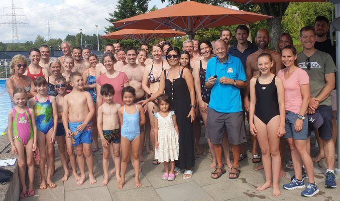Bei unserem zweiten Schwimmtermin waren am Samstag bei strahlendem Sonnenschein und ca. 25 Grad Wassertemperatur 40 (!) aktive Teilnehmer mit von der Partie. Während auf der nördlichsten Bahn des Beckens 33 mal die 25 m Kurzstrecken und 50 m Schwimmnachweise von unseren beiden Helmuts abgenommen wurden, waren auf den restlichen Bahnen in zwei Gruppen zuerst mit 10 Schwimmern die 800 Meter Langstrecke angesagt, bevor im zweiten Rennen 9 x 400 Meter und 4 x 200 Meter für die Ü50 und Jugend anstanden. Kurz danach kam es zu einem richtigen Wolkenguss, aber zum Glück ohne Gewitter, sodass der ein oder andere noch das Becken für einige Bahnen zum Ausschwimmen nutzte.